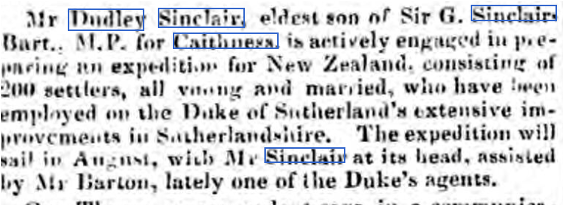 The New Zealand Company’s selling point for attracting emigrants was ‘opportunity to prosper and move up the social ladder.[2]’ Land prices were promised to be in the reach of any hard working individual or family. It was summed up rather succinctly by colonist Dr Evans, ‘the emigrants…principally of the labouring class…would, by going out to the new colony, escape from the ruinous effects of that competition from which that class [are] suffering so severely in this country’[3]. Dudley Sinclair, whose family were from Caithness but lived in Edinburgh, was through his mother, a nephew of the Tollemache brothers who had been involved with the New Zealand Company from its inception. Sinclair bought nine balloted land lots before emigrating on the Oriental in 1839 with friend Richard Barton, previous Superintendent of Estates to the Duke of Sutherland. Purchasers of land were encouraged to put forward the names of labourers for emigration for company approval, which evidently Sinclair and Barton did. Barton took with him a party sponsored from the Sutherland estate, including newly-weds John Sutherland and Mary Gordon. The Duke of Sutherland was keen to reduce the population of the region and provided his support. Promises of employment if not already contracted were given so it probably seemed a very good deal for many whose prospects seemed grim.