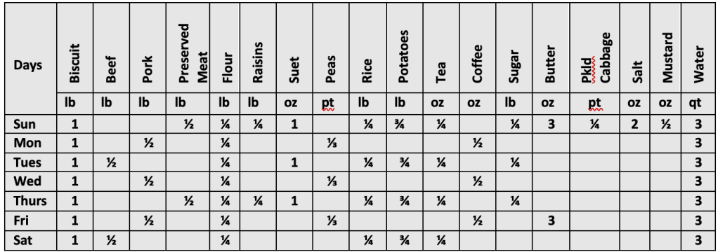 Rations for emigrants on New Zealand Company Ships in 1839 – Information relative to New Zealand compiled for the use of colonists by John Ward, Esq. Secretary to the New Zealand Company. 2ndedition. London: Harrison and Co., Printers, St. Martin’s Lane. Published Dec 1839 (Appendix No. IX. Dietary of Steerage Passengers; the Passengers to be in messes of Six or more, according to the following Scale for one Adult).