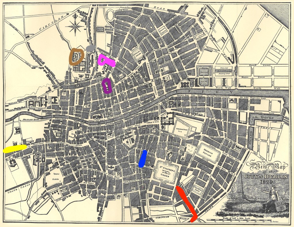 Key: Brown: Richmond Fever Hospital, Grey: Broadstone Luas Stop now, Pink: King’s Inn and Henrietta Street, Purple: Newgate Prison, Yellow: Bow Lane, Blue: Mercer Street where Thomas was arrested, Red: Leeson Street to Charlemont