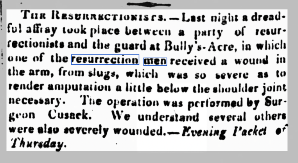 A number of rural graveyards were located in close proximity to the city and increasing demand resulted in the formation of gangs who stole to order and stored bodies at a central site for collection; it was compared to organised crime. Teeth and hair were also in demand. Some schools had to pay a retainer fee to gangs and would sometimes find themselves supporting families of jailed resurrectionists[11]. It could be a risky job as the following article published in 1831 records.