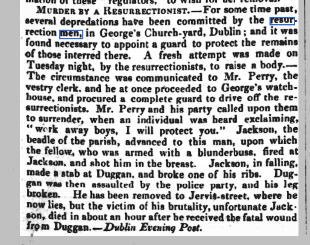 Another article reporting on the death of a beadle (official) of St George’s parish on the north side of Dublin showed the dangers to the public of confronting determined gangs of men.