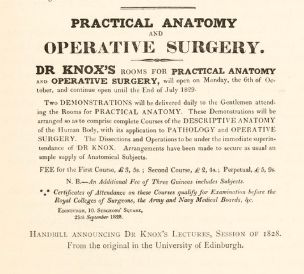 In 1828 a Select Committee Report on Anatomy suggests eight hundred students were attending medical schools in London alone with around sixty two percent of them practising dissection. The Corporation of Surgeons required students to produce a certificate stating they had attended a minimum of two courses of dissection – herein lay a problem for many students, few bodies for dissection where voluntary donated for the purpose of education[8]. As the following advertisement from Dr Knox in Edinburgh shows, anatomists where making significant profits from their lectures.
