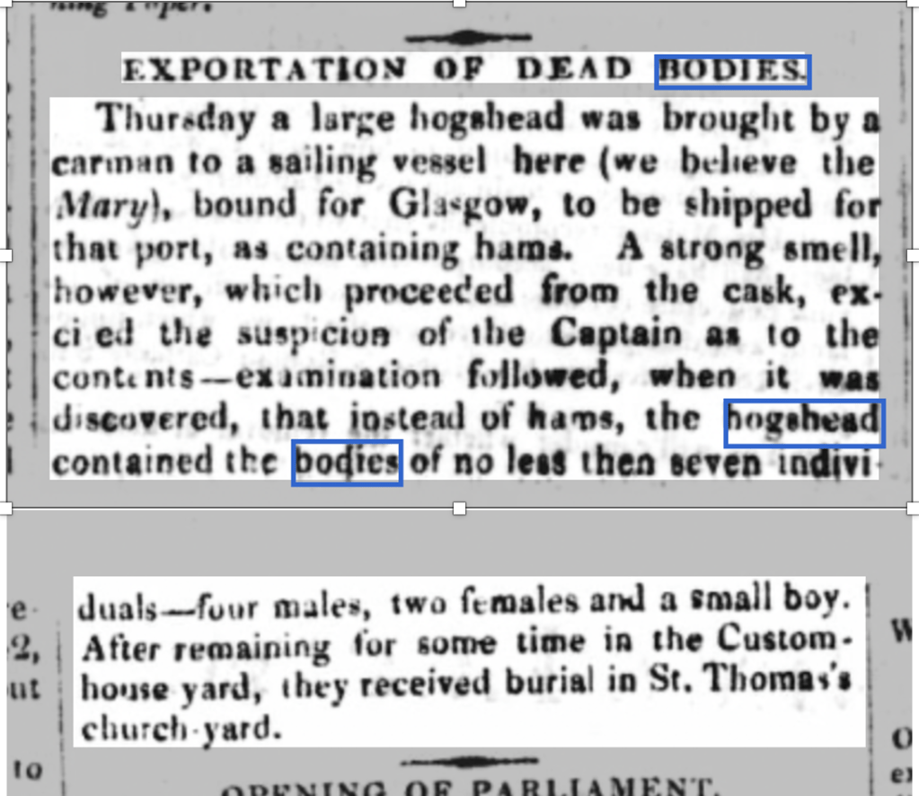 Sometimes bodies were absconded with before burial. Female members of gangs would pose as relatives of the deceased in workhouses or in the case of accidents and be entrusted with the responsibility for burial. In the early nineteenth century prices in London were sky rocketing to about £14 per body. Dublin was considerably cheaper, often more than 1500 percent cheaper in the late 1820s. A maximum recorded price in London for Irish exports £38 for three in late 1831. Some were stored at the College of Surgeons before export.[13] The papers included several reports of the trade. An example is in the article below, published in 1829.