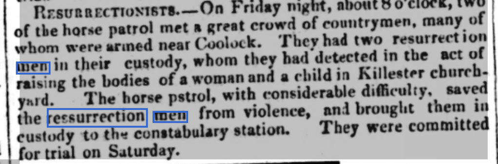 ‘A Sanguinary Affray with Resurrection Men’ in 1828 recorded a scene of ‘blood and outrage’ in Merrion Church-yard in which four brothers of a deceased sister and some of their friends kept watch on the grave. After leaving to rest in a nearby cabin whilst leaving two to keep watch, nine or ten people knocked and asked to have the grave pointed out so they might avoid it while they went about their business or raising subjects for dissection. The brothers and their friends refused to allow any bodies to be taken resulting in a brawl with ‘sticks, stones and fists’. The gang retired, threatening to be back at which time ‘the mildest consequence’ would be the loss of their loved one. They did return in the early hours of the morning with up to forty men armed guns, spades and pick axes. The brothers had also gathered reinforcements and a battle ensued. Injuries were numerous and severe with the streets back to city marked with traces of blood as the gang fled with their injured vowing vengeance. The graveyard walls, stones and tombs were liberally marked with shot.[15]